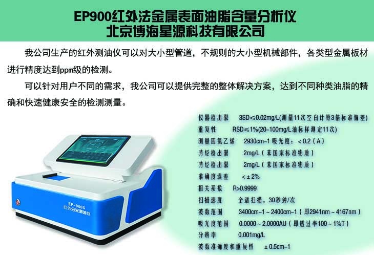 北京博海星源专业研发生产金属表面油含量分析仪,采用红外分光光度法,紫外分光光度法,紫外荧光法进行测量,主打产品有EP600红外法金属表面油脂含量分析仪,EP900红外法金属表面油脂含量分析仪,UV910紫外法金属表面油脂含量分析仪,F680荧光法金属表面油脂含量分析仪,EP3000B红外或紫外或荧光在线金属表面油脂含量分析仪。