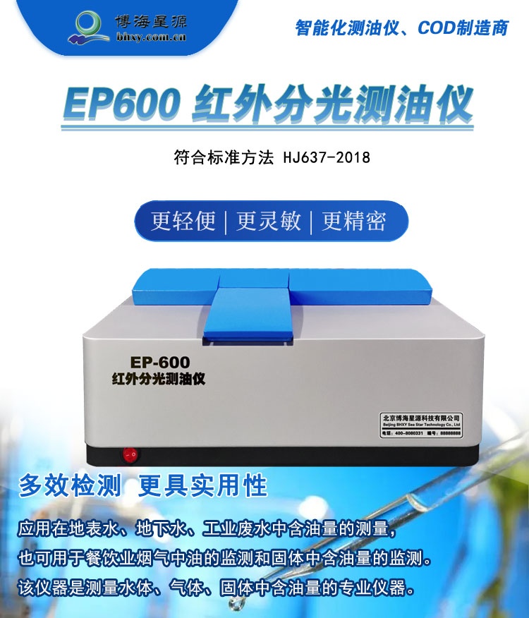 环境监测系统、石油化工、水文水利、自来水、污水处理厂、火力发电厂、钢铁企业、高校科研教学、农业环境监测、铁路环境监测、汽车制造、海洋环境监测、交通环境监测、环境科研等检测室、实验室使用。红外测油仪第三方检测机构博海星源EP600