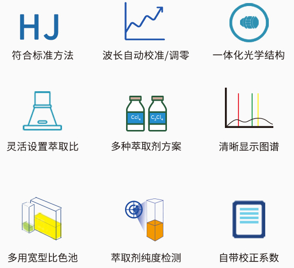2) 厂家配备标准油滤光片,可长期进行单点校正,单次标准曲线终身免更换,免除配置标油有毒试剂;