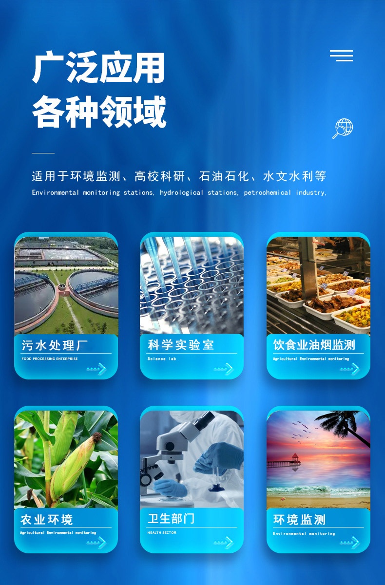 环境监测系统,石油化工、水文水利、自来水公司、污水处理厂、火力发电厂、钢铁企业、高校科研教学、农业环境监测、铁路环境监测、汽车制造、海洋环境监测、交通环境监测、环境科研等检测室、实验室使用。