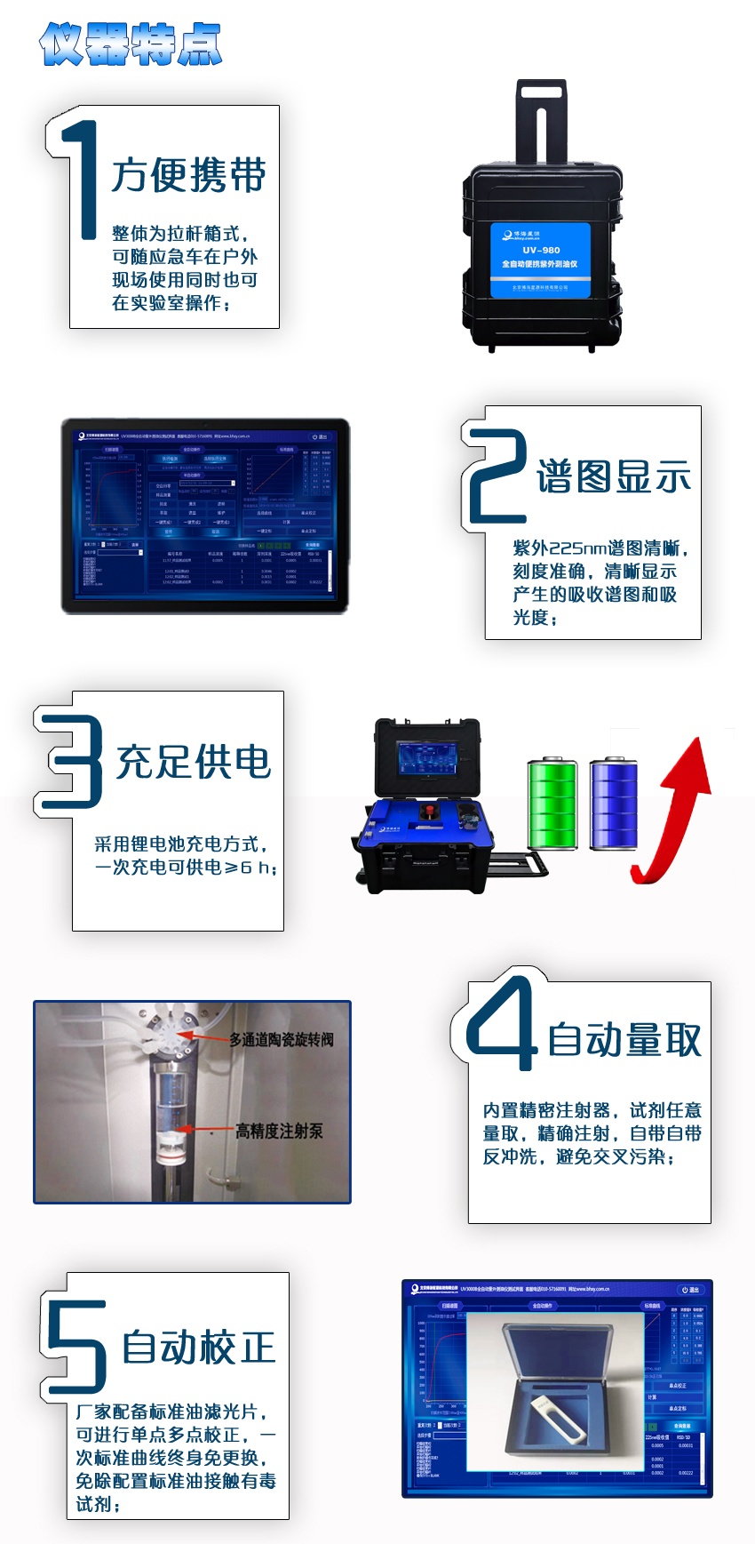 主要用于突发环境污染事件中地表水、地下水、海水中石油类的测定。技术原理符合《水质 石油类的测定 紫外分光光度法》(HJ970-2018)。
