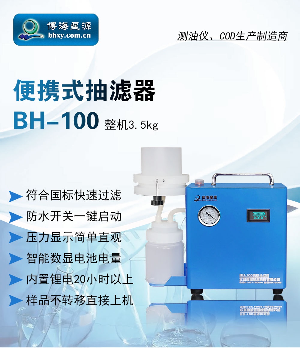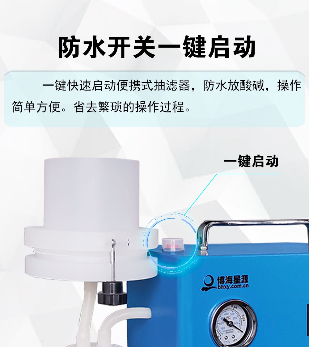 便携式真空抽滤器自带高容量锂电池,可以实现现场抽滤,适合野外现场使用,续航时间长达20小时以上;