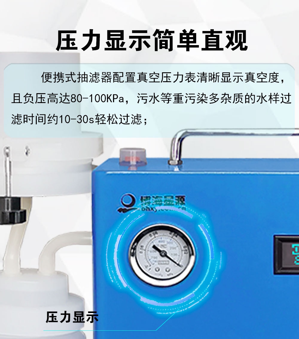 真空压力表清晰显示真空度,且负压高达80-100KPa,污水等重污染多杂质的水样过滤时间约10-30s轻松过滤;