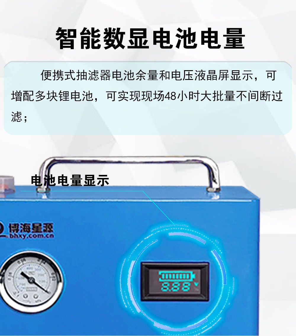 电池余量和电压液晶屏显示,可增配多块锂电池,可实现现场48小时大批量不间断过滤;