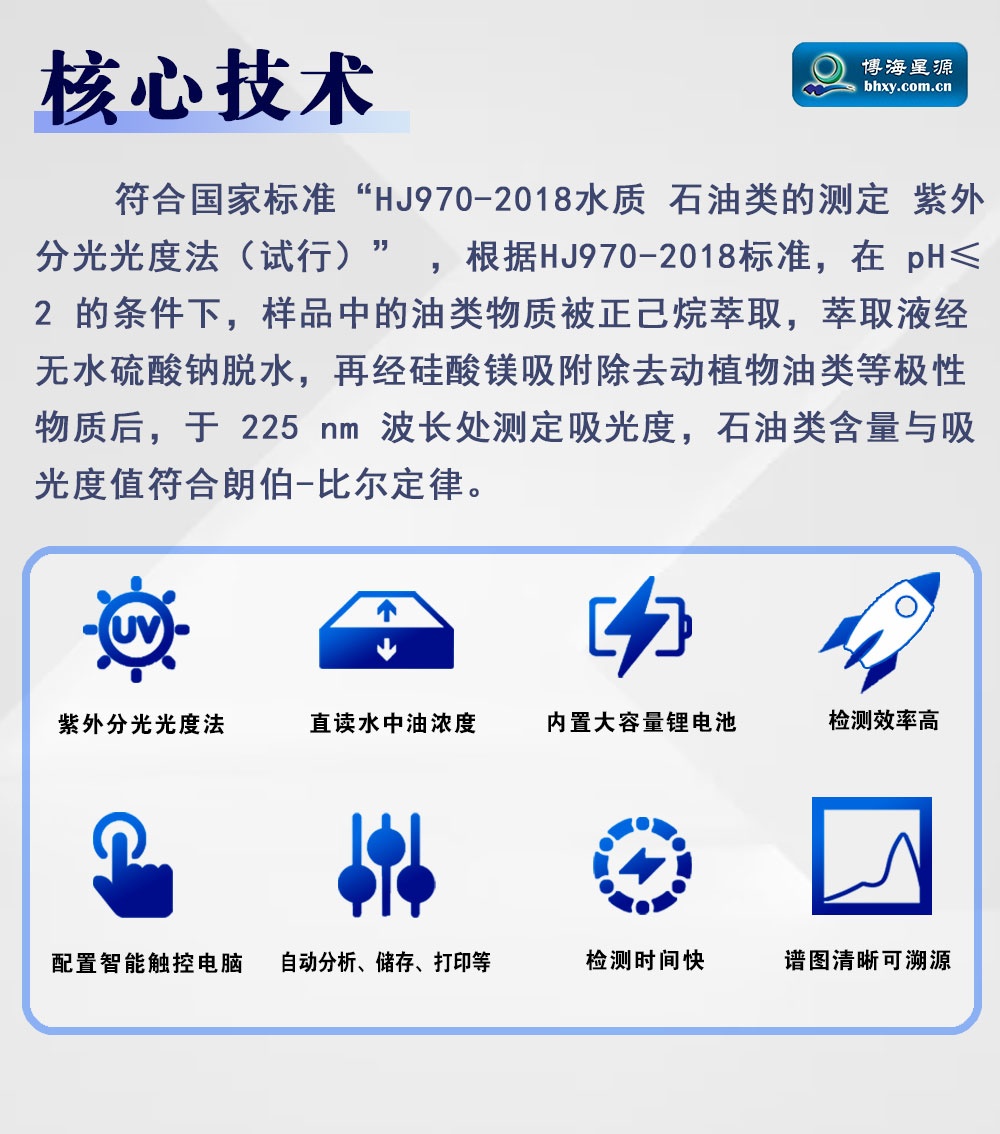 符合国家标准“HJ970-2018水质 石油类的测定 紫外分光光度法(试行)” ,根据HJ970-2018标准,在 pH≤2 的条件下,样品中的油类物质被正己烷萃取,萃取液经无水硫酸钠脱水,再经硅酸镁吸附除去动植物油类等极性物质后,于 225 nm 波长处测定吸光度,石油类含量与吸光度值符合朗伯-比尔定律。