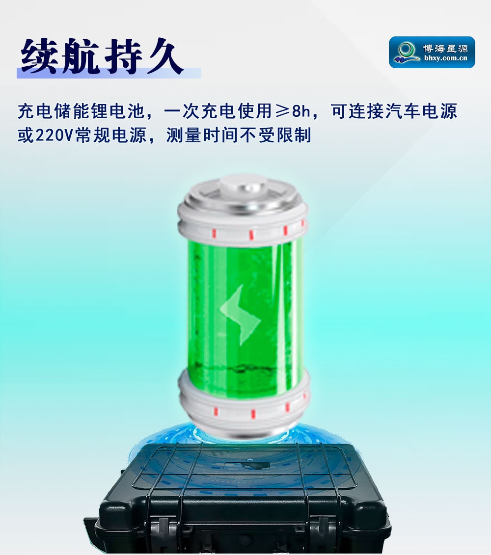 14. 充电储能:采用锂电池,一次充电使用≥8 h,可连接汽车电源或220V常规电源,测量时间不受限制;