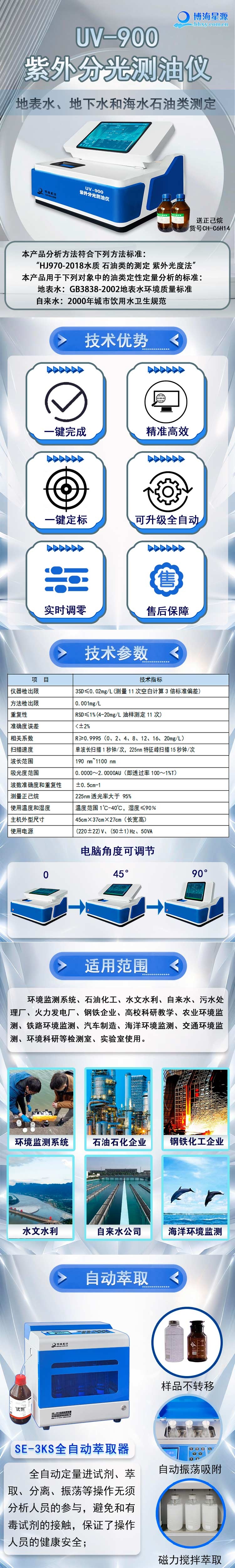 紫外分光测油仪是一种环保、精准、快捷的测油仪器,它用正己烷萃取剂替代红外法中已被禁用的萃取剂,符合国标《HJ 970-2018 水质 石油类的测定 紫外分光光度法》的要求。该产品操作简单、精密度好、灵敏度高、性能稳定,能满足用户的各种应用需求。