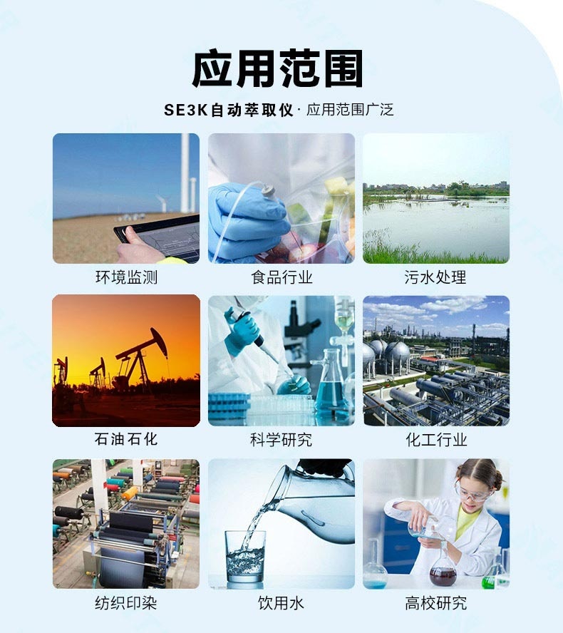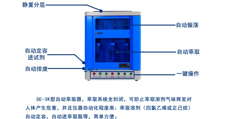 2) 健康安全,萃取和清洗无需人工定量和手动加入试剂,杜绝分析人员和有毒溶剂的接触;