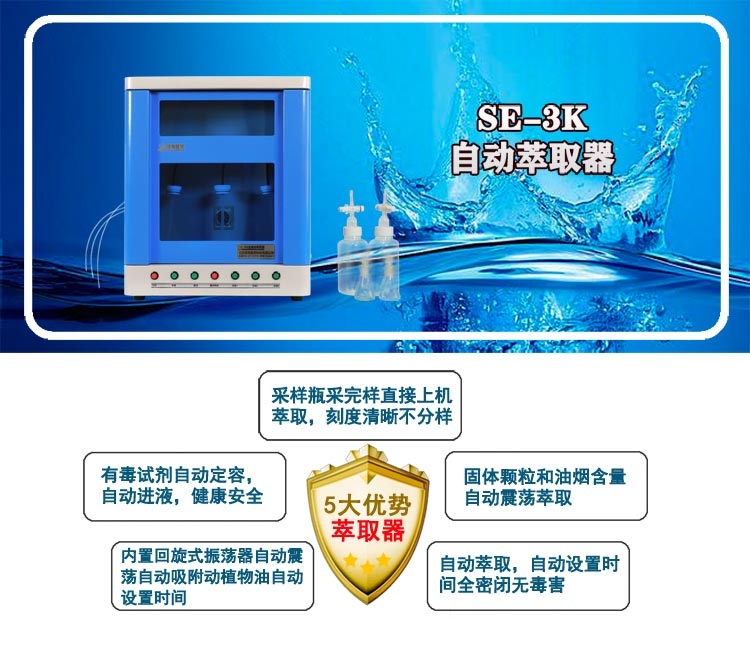 SE-3K型采用全封闭萃取系统,萃取溶剂自动定容,自动进萃取瓶,自动萃取,自动振荡。化验中采用振荡或分液漏斗手摇萃取,这两种方法既笨重,效率又低,人工劳动强度大,而且所用溶剂给实验人员带来严重的健康危害。为此我单位研制开发了SE系列全自动液液萃取器.SE-3K型适合用于水质监测中的水中油、挥发酚,阴离子等的各类需要液液萃取的场合,具有自动化程度高、省时省力等优点。