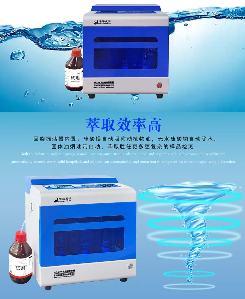在日常化验中萃取一般采用振荡或分液漏斗手摇萃取,这两种方法不但笨重,效率低,劳动强度大,而且所用溶剂给实验人员带来严重的健康危害,SE-3KS型可以解决此类问题。