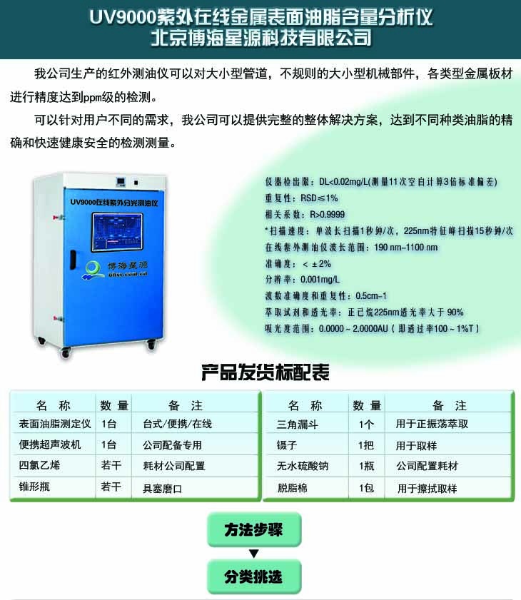 北京博海星源专业研发生产金属表面油含量分析仪,采用红外分光光度法,紫外分光光度法,紫外荧光法进行测量,主打产品有EP600红外法金属表面油脂含量分析仪,EP900红外法金属表面油脂含量分析仪,UV910紫外法金属表面油脂含量分析仪,F680荧光法金属表面油脂含量分析仪,EP3000B红外或紫外或荧光在线金属表面油脂含量分析仪。